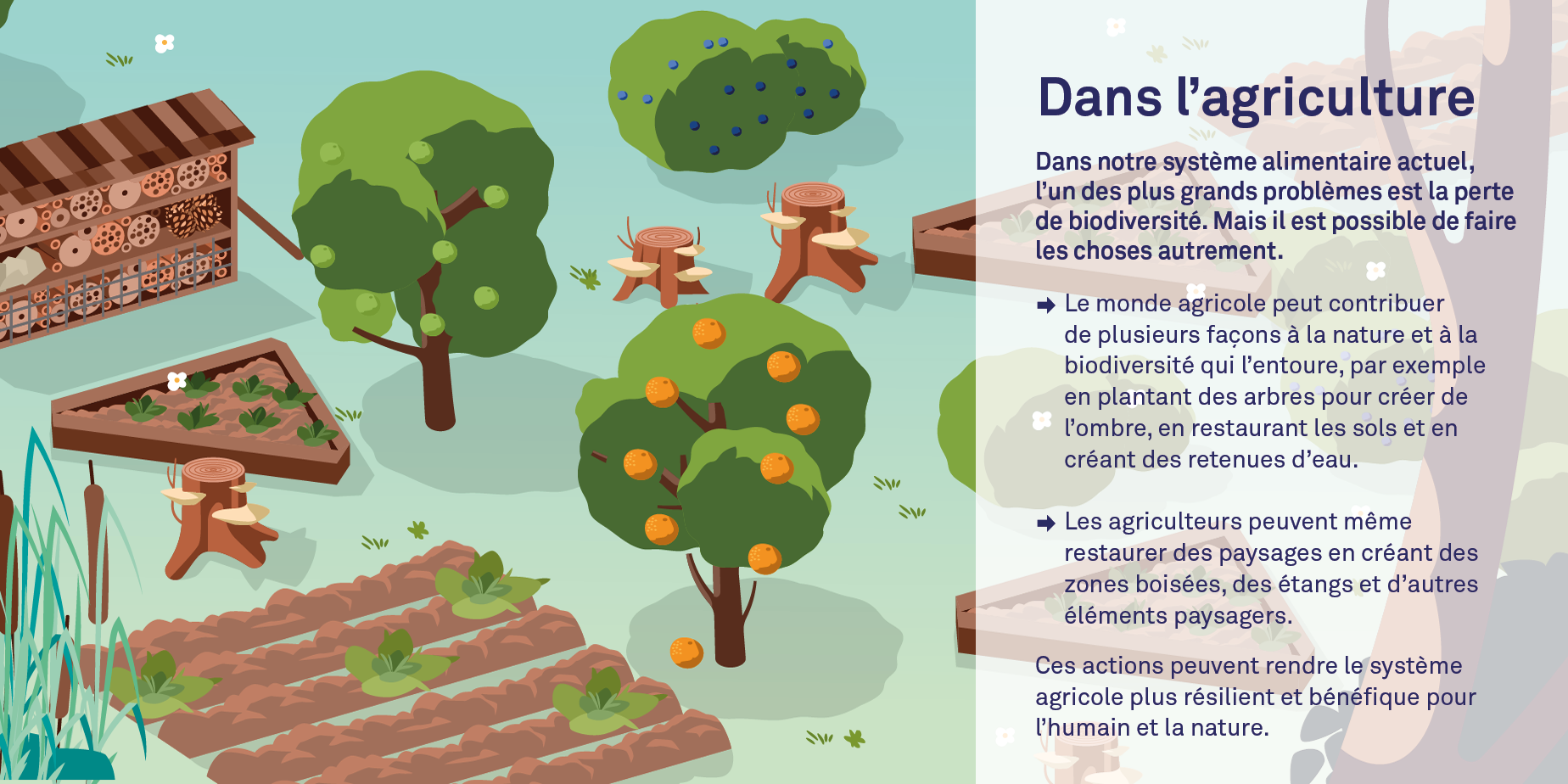 - Dans l’agriculture : Aujourd’hui, l’un des principaux problèmes de notre système alimentaire est la perte de biodiversité. La production alimentaire réclame toujours plus de terres, souvent au détriment de la nature. En plus, l’agriculture reste très polluante à cause des engrais et des pesticides, et elle joue un rôle non négligeable dans le changement climatique. Mais il y a une autre voie : on peut pratiquer une agriculture en harmonie avec la nature. En s’y prenant intelligemment, nous pouvons profiter des atouts de la nature, encourager la biodiversité et restaurer la qualité des sols. Les forêts nourricières et l’agriculture syntropique sont de bons exemples de cette approche.