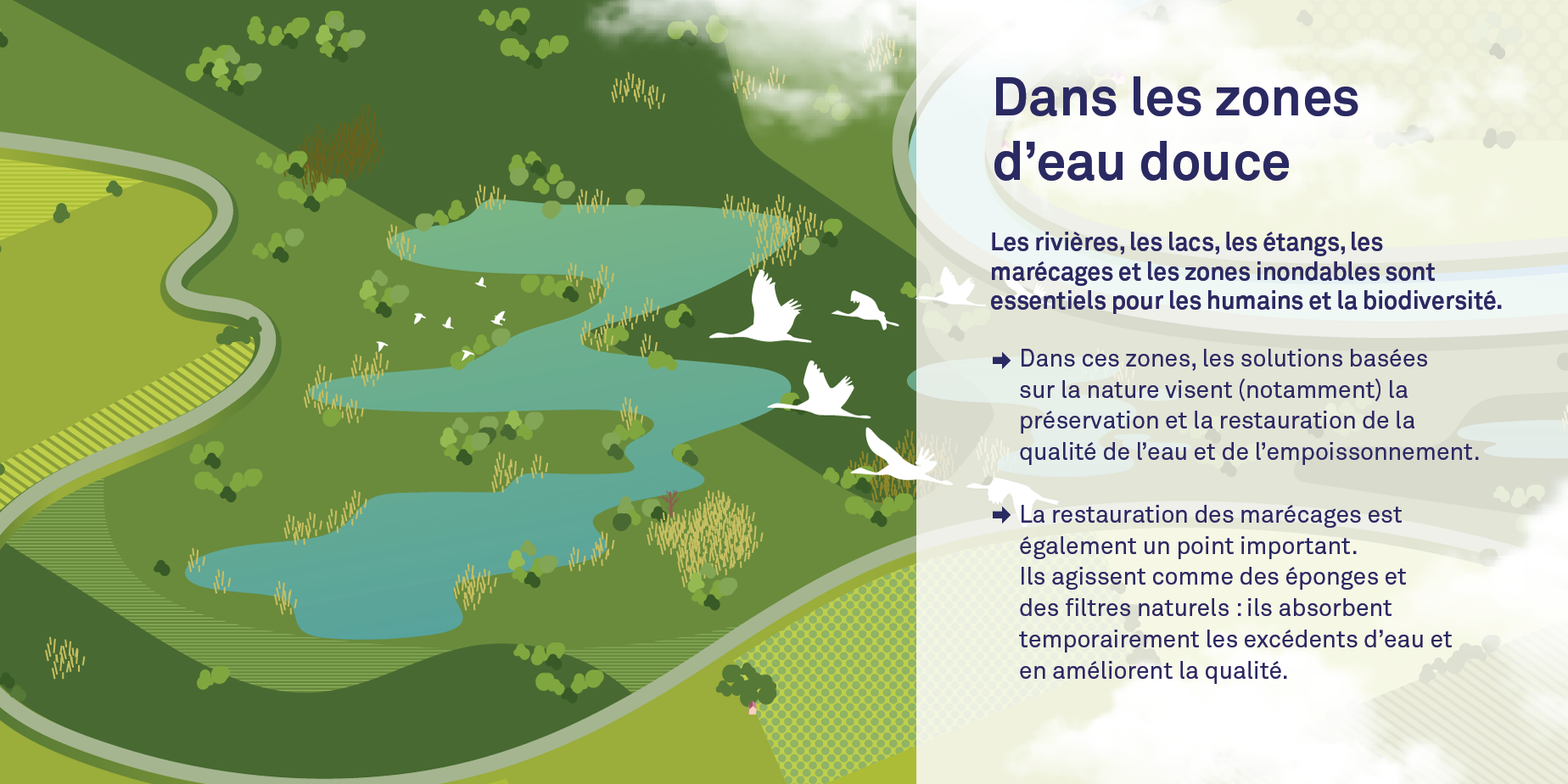 - Dans les zones d’eau douce : Les rivières, fleuves, lacs, étangs, zones humides (qu’elles soient toujours ou temporairement saturées d’eau) et les plaines inondables ont toutes quelque chose en commun : elles sont cruciales pour les humains et la biodiversité. Les projets NBS dans ces milieux visent surtout à préserver et restaurer la qualité de l’eau et la vie aquatique, ainsi qu’à réduire les risques d’inondation. La protection et la restauration des zones humides, qui jouent un rôle clé dans la gestion de l’eau, sont aussi un objectif majeur.
