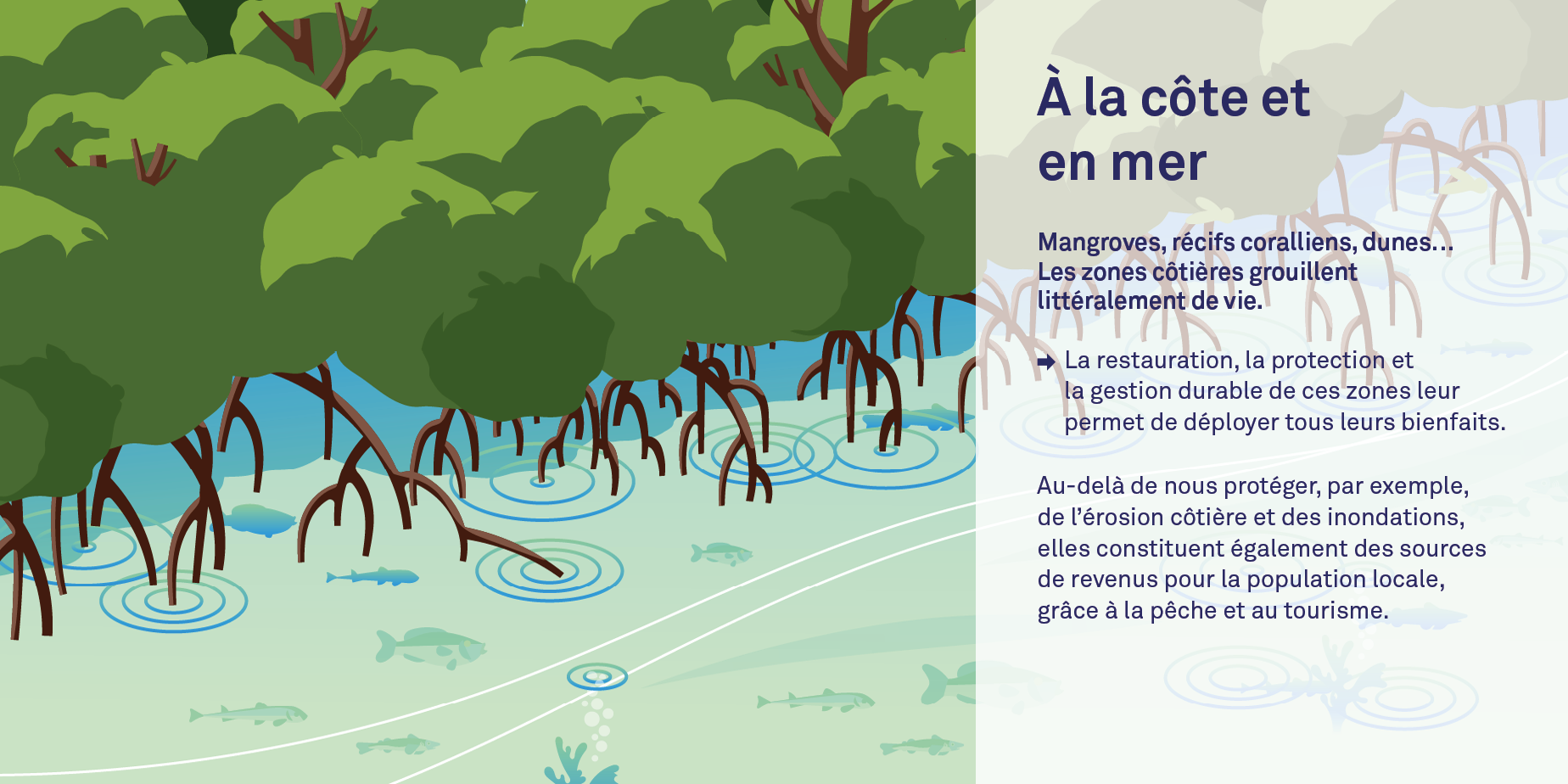 - À la côte et en mer : Côté littoral et mer, on retrouve des écosystèmes comme les mangroves, les récifs coralliens ou les dunes, qui rendent de grands services. Les mangroves, par exemple, nous protègent contre les inondations et l’érosion des côtes, tout en offrant un habitat à une grande variété d’espèces marines. Les récifs coralliens, eux, favorisent le tourisme, protègent les rivages de l’assaut des vagues et sont de véritables réservoirs de biodiversité. Les projets NBS dans ces zones ont pour but de restaurer et de protéger ces écosystèmes. On peut citer, par exemple, les bancs d’huîtres, qui purifient l’eau et améliorent la biodiversité marine.