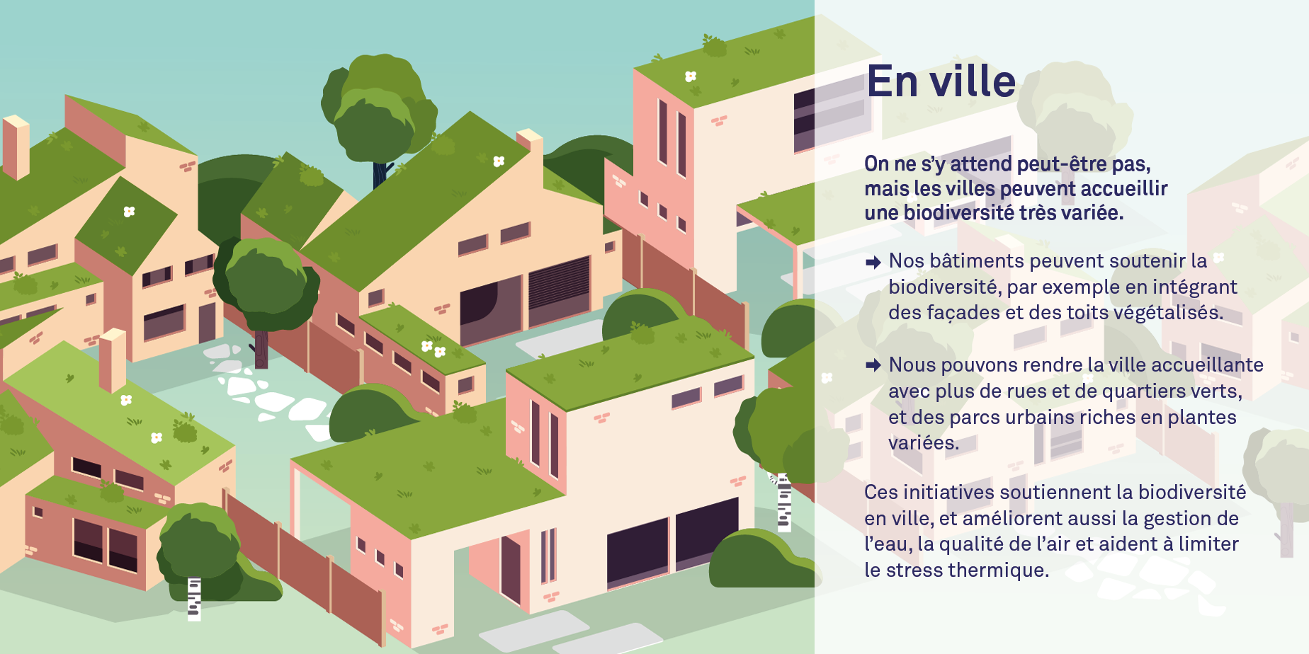 - En ville : Oui, même en ville, il est tout à fait possible de collaborer avec la nature. En végétalisant les toits et les façades, ou en créant des parcs et des quartiers éco-intégrés, nous renforçons la biodiversité urbaine. Ces initiatives améliorent aussi la gestion de l’eau, la qualité de l’air et aident à limiter le stress thermique.