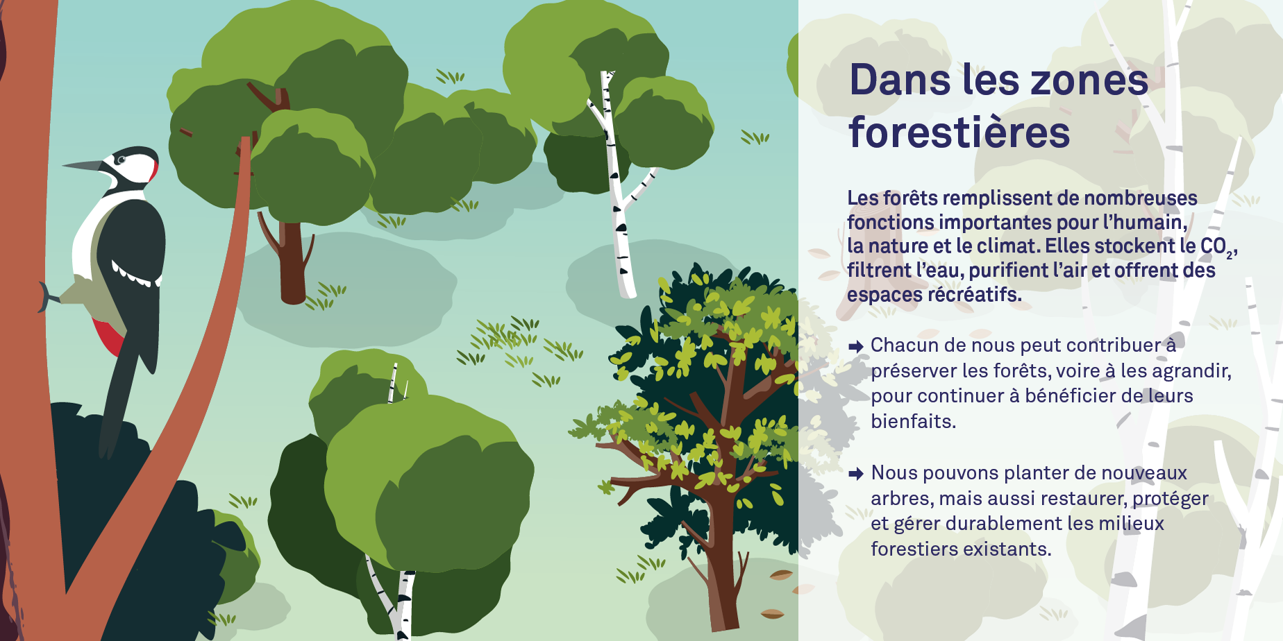 - Dans les zones forestières : Les forêts remplissent plein de fonctions essentielles pour nous, pour la nature et pour le climat. Elles absorbent le CO₂, stabilisent les sols, filtrent l’eau, purifient l’air et offrent des espaces pour se ressourcer. Elles fournissent également du bois et abritent une faune diversifiée. La déforestation sauvage, c’est tout sauf une collaboration avec la nature. Ici, les solutions fondées sur la nature cherchent à protéger et restaurer les zones abîmées, à planter de nouveaux espaces forestiers variés et à gérer les forêts de manière responsable et durable. En faisant cela, les fonctions des forêts sont préservées, voire renforcées.