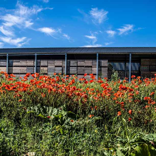 Het gebouw is honderd jaar oud; een gerenoveerde hoeve met een orangerie, handgemaakte keuken en een zwemvijver met biologische zuivering. De winkel is in opbouw; de paardenstallen en schuren zijn voor de kippen. Zo’n 400 zijn het er al.
