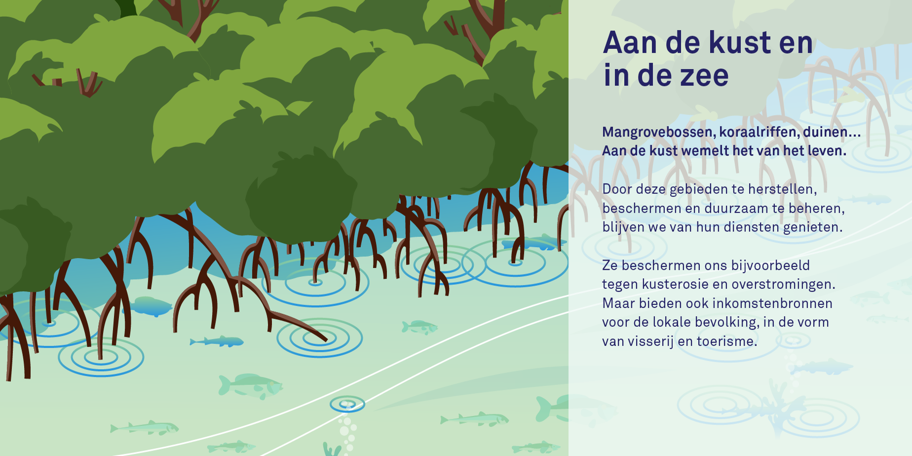 - Aan de kust en in de zee: Bij ecosystemen aan de kust en in zee kun je denken aan mangrovebossen, koraalriffen en duinen. Ook deze gebieden vervullen allerlei essentiële diensten. Zo bieden mangrovebossen bescherming tegen overstromingen en kusterosie en zijn ze een veilige habitat voor allerlei zeediersoorten. Koraalriffen bieden op hun beurt kansen op het gebied van toerisme, beschermen kustgebieden tegen golven en zijn hotspots voor biodiversiteit. NbS-projecten op dit gebied richten zich op het herstellen en beschermen van deze ecosystemen. Denk bijvoorbeeld aan oesterriffen, die water zuiveren en de biodiversiteit van het zeeleven verbeteren.