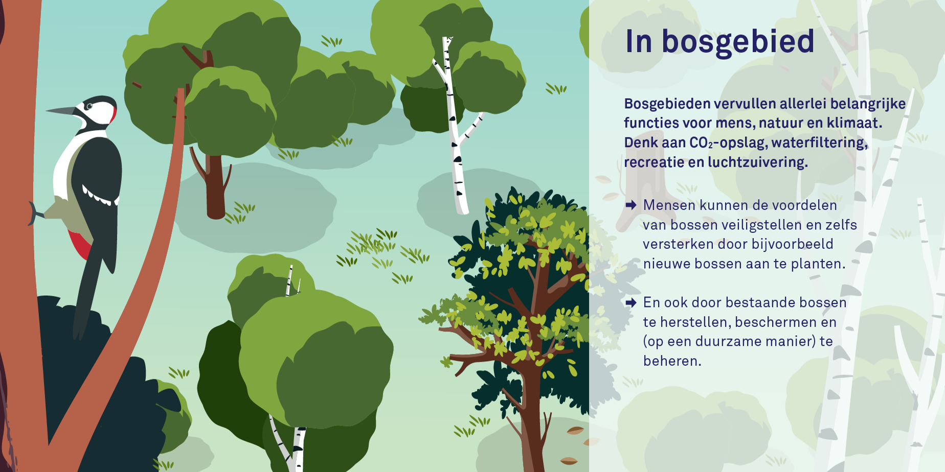 - In bosgebied: Bosgebieden vervullen allerlei belangrijke functies voor mens, natuur en klimaat. Ze zorgen bijvoorbeeld voor CO2-opslag, een stabiele bodem, waterfiltering, luchtzuivering en recreatie voor mensen. Daarnaast zijn ze een belangrijke bron van hout én een fijne habitat voor allerlei diersoorten. Nu is ongereguleerde ontbossing natuurlijk allesbehalve een samenwerking met de natuur. Nature-based solutions op dit gebied draaien dan ook om het behouden en herstellen van ontboste gebieden, het aanplanten van nieuw, gevarieerd bosgebied en verantwoord en duurzaam bosbeheer. Op die manier worden de functies van bosgebieden veilig gesteld en zelfs versterkt.