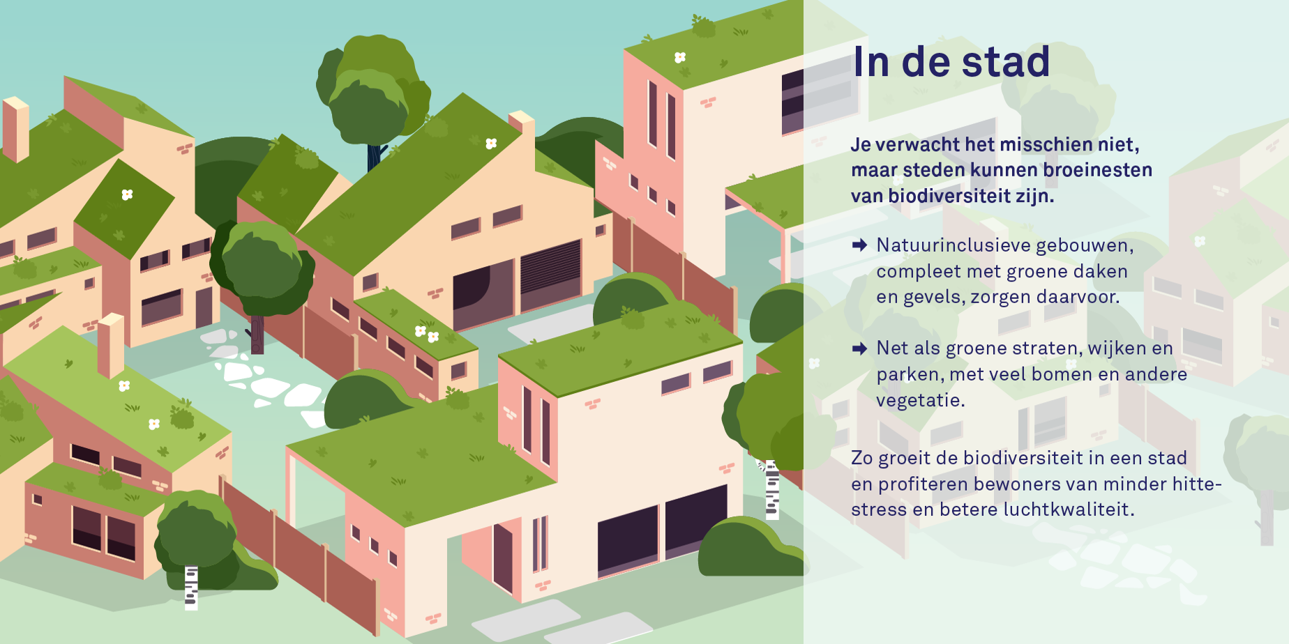 - In de stad: Ook in de stad zijn samenwerkingen met de natuur heel goed mogelijk. Denk bijvoorbeeld aan groene daken en gevels, parken en natuurinclusieve wijken. Dergelijke initiatieven versterken de biodiversiteit in stad en zorgen tegelijkertijd voor beter watermanagement, minder hittestress en betere luchtkwaliteit.