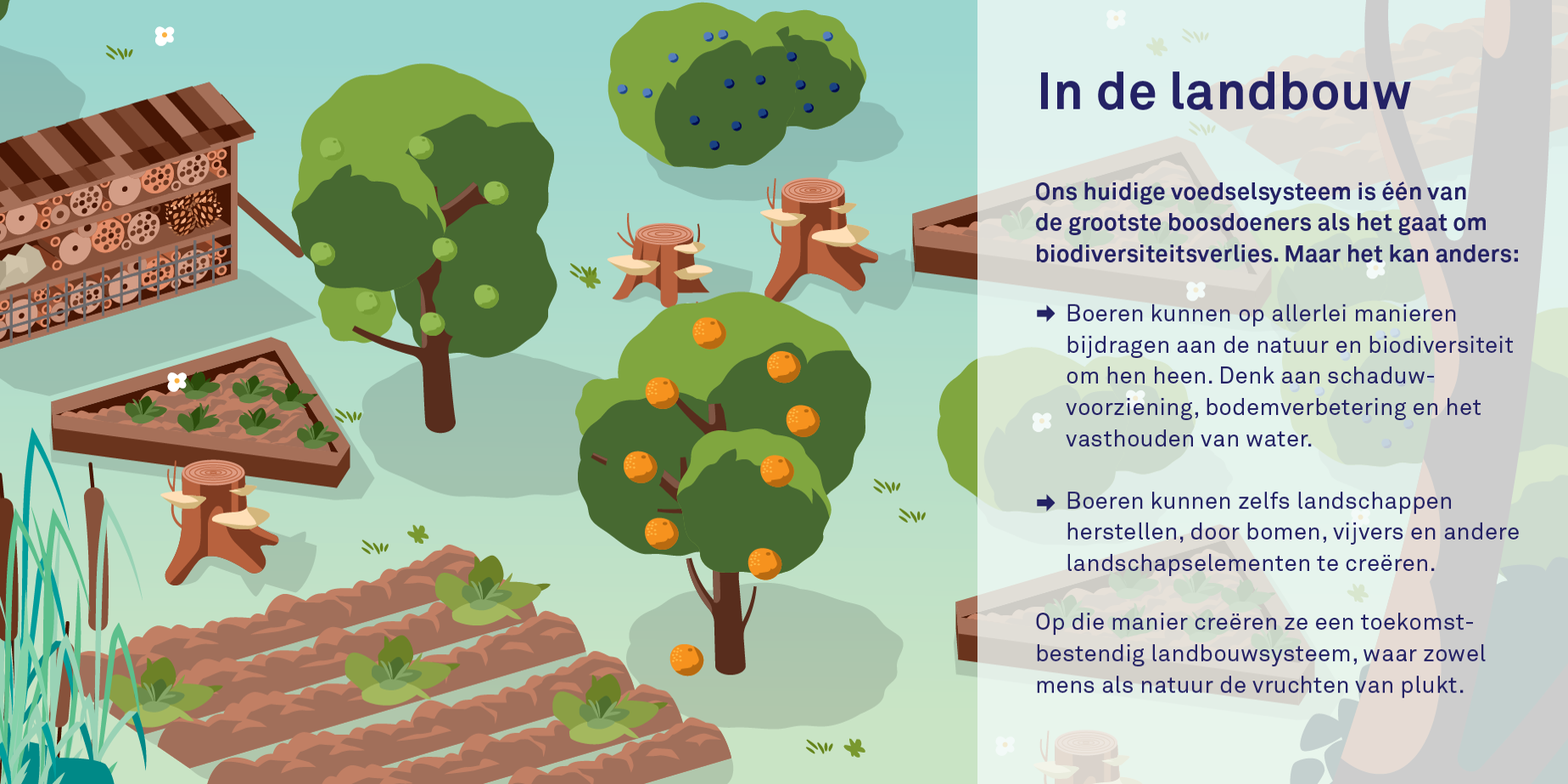- In de landbouw: Ons huidige voedselsysteem is een van de grootste boosdoeners als het gaat om biodiversiteitsverlies. Er is bijvoorbeeld steeds meer land nodig voor voedselproductie en dat gaat vaak ten koste van de natuur. Daarnaast zorgt de agrarische sector voor ontzettend veel vervuiling (denk aan het gebruik van kunstmest en bestrijdingsmiddelen) én draagt hij fors bij aan klimaatverandering. Maar het kan ook anders. Landbouwactiviteiten kunnen ook in harmonie met de natuur plaatsvinden. Wie het slim aanpakt, kan zowel de vruchten van de natuur plukken als biodiversiteit bevorderen en de bodem gezonder maken. Voedselbossen en syntropische landbouw zijn daar goede voorbeelden van.