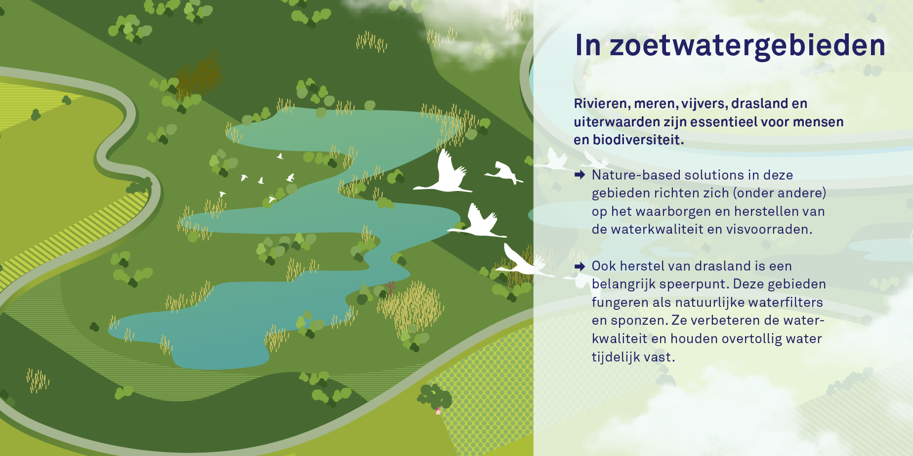 - In zoetwatergebieden: Rivieren, meren, vijvers, drasland (land dat permanent of tijdelijk door water is verzadigd) en uiterwaarden hebben een belangrijk ding gemeen: ze zijn essentieel voor mensen en biodiversiteit. NbS-projecten in deze categorie richten zich vaak op het waarborgen en herstellen van de waterkwaliteit en visvoorraden in deze gebieden en het terugdringen van overstromingsrisico’s. Ook het beschermen en herstellen van drasland (dat weer een belangrijke functie vervult op het gebied van watermanagement) is een belangrijke speerpunt.
